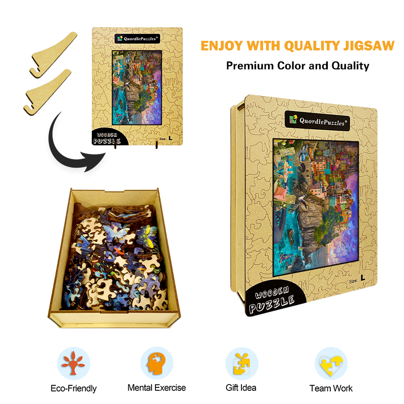 Questo puzzle in legno è realizzato in materiale di tiglio privo di formaldeide, che presenta un trattamento superficiale liscio. Ed è di alta qualità, durevole e resistente alla corrosione. Dopo il trattamento di tintura ecologico è presente uno strato protettivo che può essere conservato per decenni, appeso al muro o utilizzato per scopi espositivi.