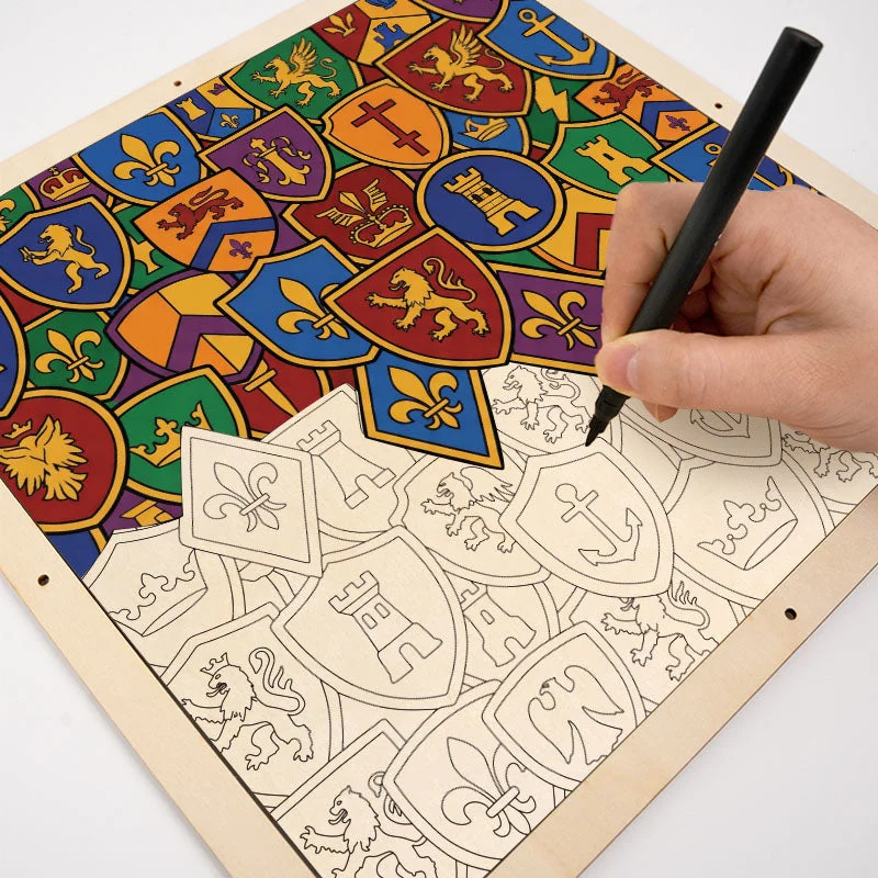 Ogni set è composto da pezzi di legno splendidamente tagliati che si incastrano tra loro formando un'affascinante illustrazione, pronta per essere animata con i colori.